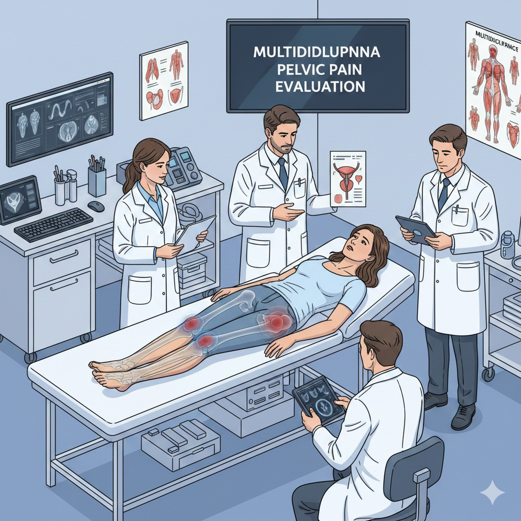 Long-term pelvic discomfort requiring multidisciplinary evaluation.