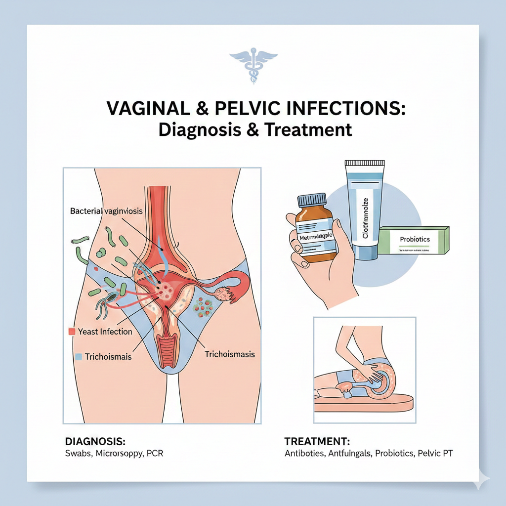 Diagnosis and treatment of vaginal and pelvic infections.